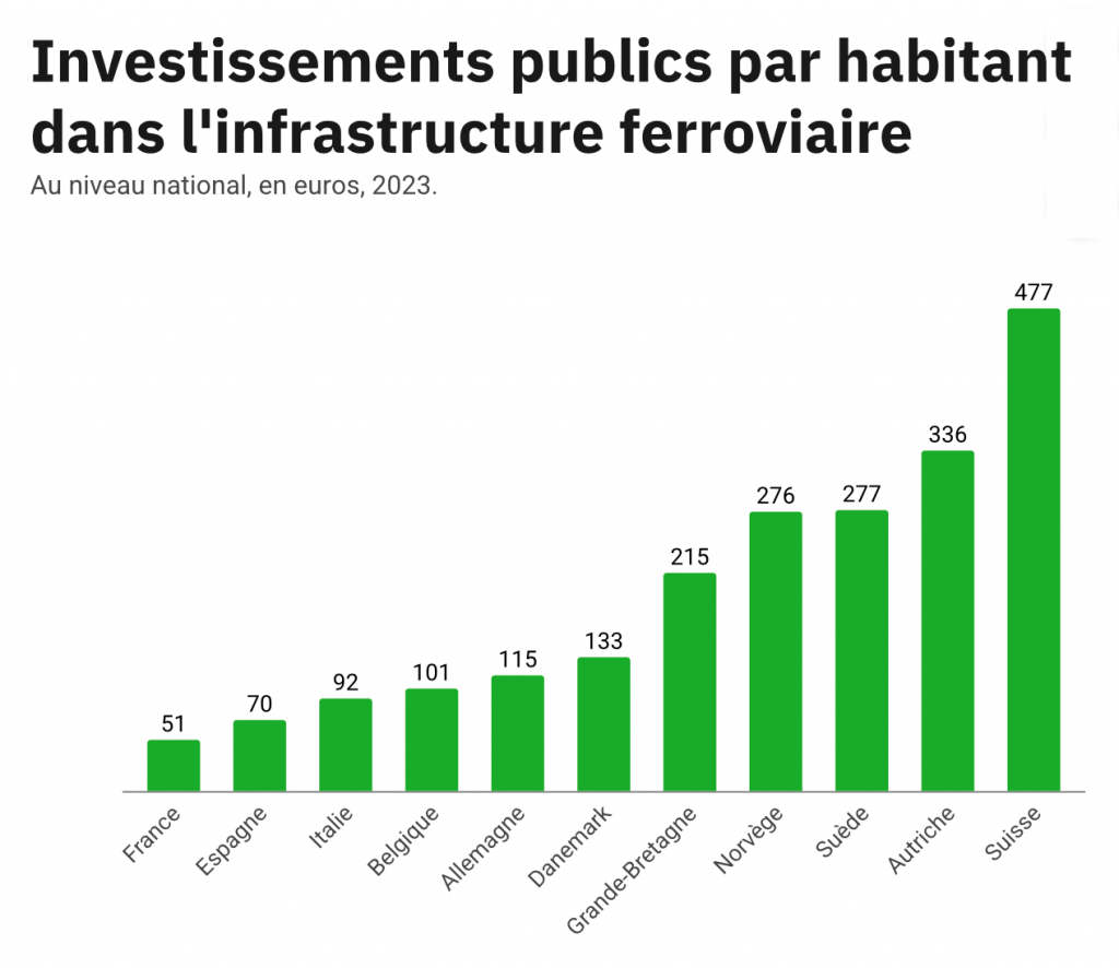Le train est un mode de transport particulièrement écologique : il consomme six fois moins d’énergie et émet neuf fois moins de CO2 que le transport routier. Pourtant, notre réseau ferroviaire se détériore, conséquence des sous-investissements de l’État. Nous sommes d’ailleurs l’un des pays d’Europe qui investit le moins dans ses trains.